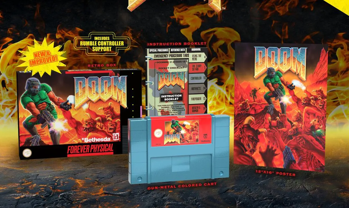 Limited Run knew exactly what the DOOM crowd was looking forward to: this really was the ultimate upgrade for the super-Doom on SNES, with 14 new levels, a Nightmare Mode, circle strafing, and rumble support, with the concept coming to bear on the SNES for the first time in history. You heard right–rumble on SNES.