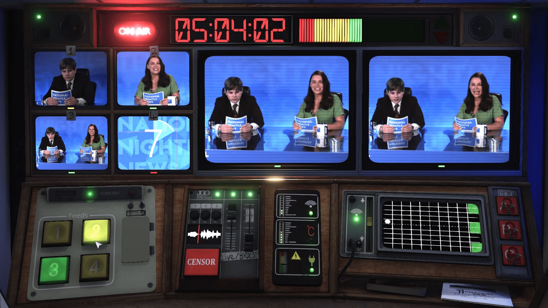 Not For Broadcast is quite a unique take, even for the dystopian genre that is becoming increasingly relevant in our modern interconnected climate; you’re been hired to clean a studio and end up controlling the national nightly news broadcast. You control what is shown, the angles and featured aspects, the advertisements, and even bleeping profanity as it rolls across your command console an into the televisions around the nation.