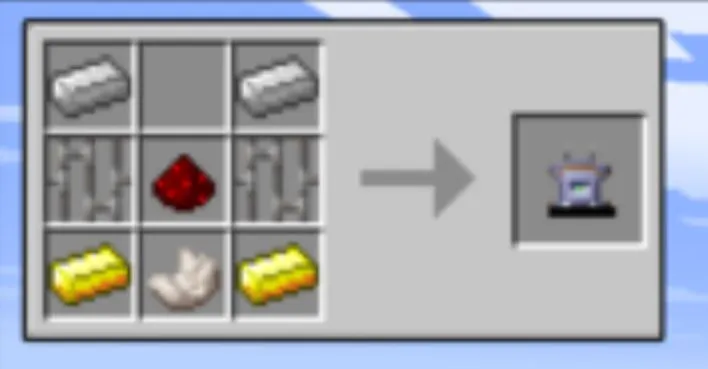 The crafting recipe for this scanner consists of two iron ingots on either top side of the crafting grid, and the middle row consists of iron bars, then Redstone, and the final spot has iron bars. The last row of the crafting grid has a gold ingot, nether quartz, and a second gold ingot.