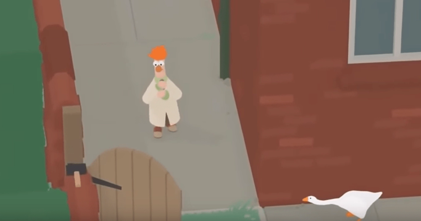 Beaker gets chased off by the game’s infuriating broom wielding shopkeeper. Then we see House House’s mischevious Goose himself laying in wait for poor Beaker as he walks out of an alley.